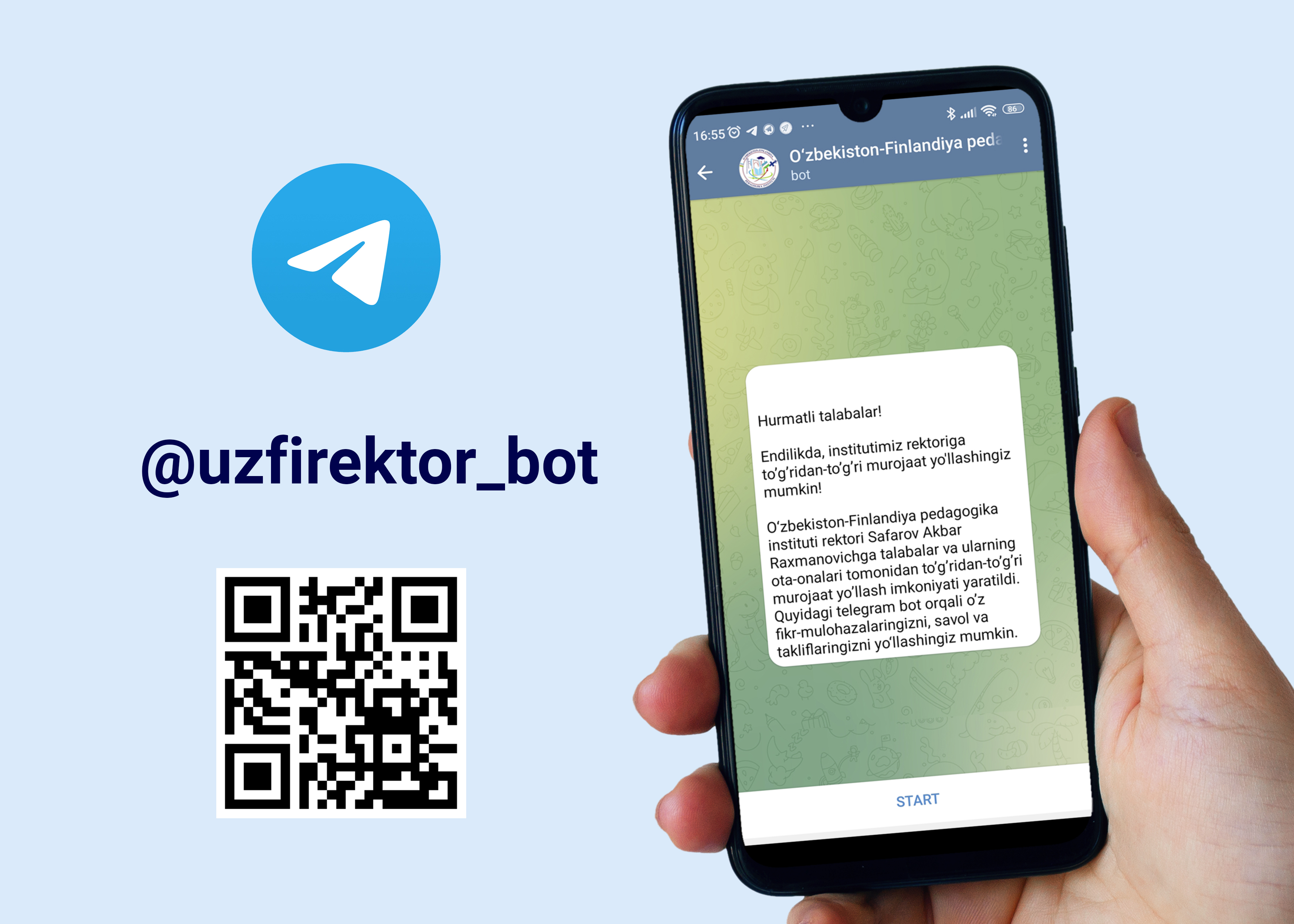 O‘quv jarayonlari, ilmiy innovatsion g‘oyalarni qo‘llab-quvvatlash, institutimizning ta’lim sifati va samaradorlik ko‘rsatkichlarini yanada oshirish hamda rivojlantirishga qaratilgan takliflar, tavsiyalar, g‘oyalar va savollarni ushbu @uzfirektorBot orqali yo‘llashingiz mumkin.