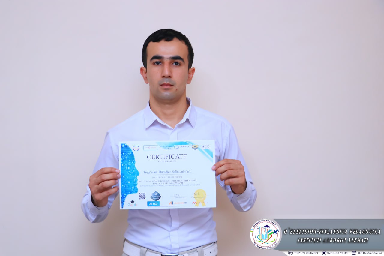 O‘zbekiston–Finlandiya pedagogika instituti Aniq-tabiiy fanlar va jismoniy madaniyat fakulteti 2-bosqich talabasi Tuyg‘unov Murodjon Salimqul o‘g‘li “Results of National Scientific Research Journal 2023” jurnalida o‘zining “Ta’lim sifati samaradorligini oshirishda internetdan foydalanishning ahamiyati” mavzusidagi maqolasi bilan ishtirok etdi va sertifikat bilan taqdirlandi.