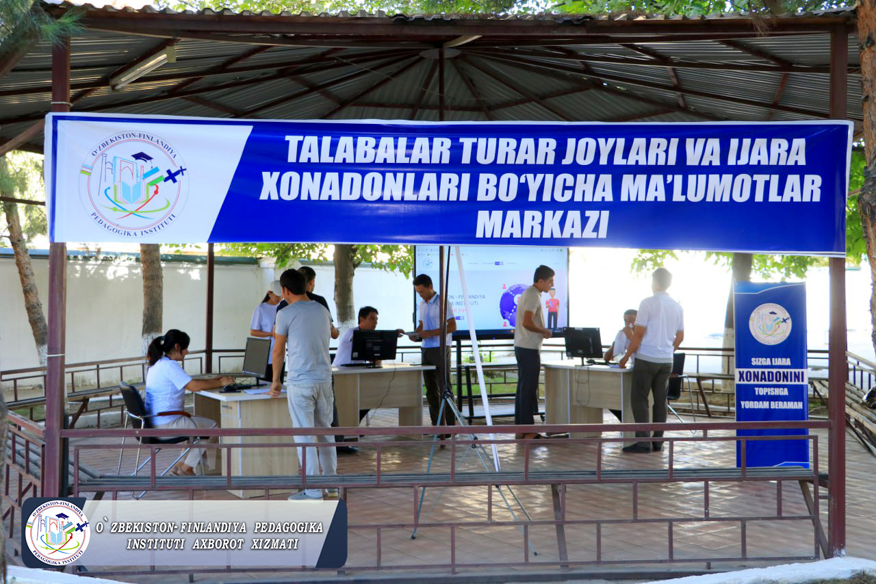 Jumladan, O‘zbekiston-Finlandiya pedagogika institutida talabalar va ularning ota-onalarini kutib olish hamda ularga zarur ko‘rsatma va ma’lumotlar berish uchun “Talabalar turar joylari va ijara xonadonlari bo‘yicha ma’lumotlar markazi” doimiy ravishda, ertalab soat 08:00 dan kech soat 20:00 ga qadar faoliyat yuritib kelmoqda.