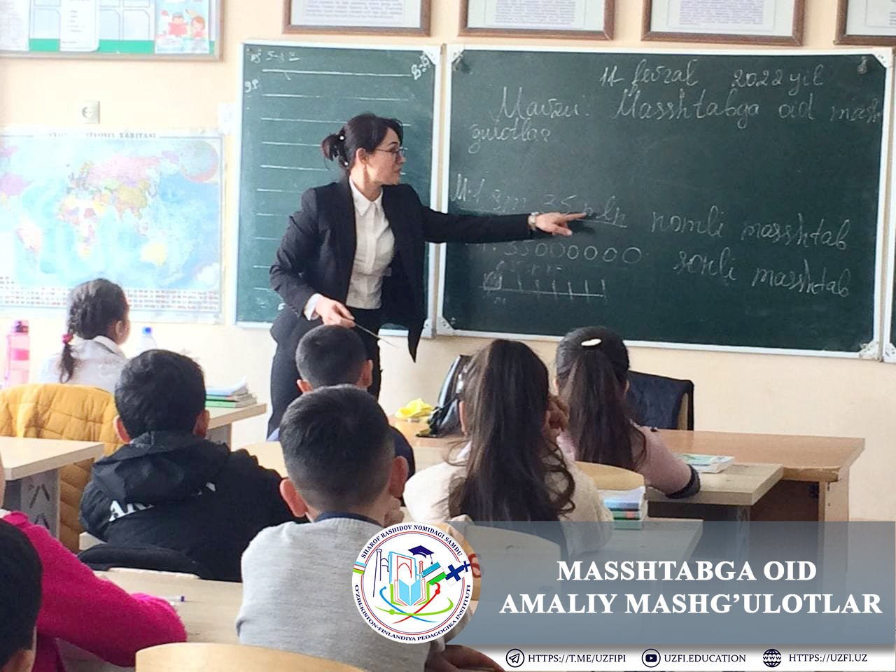 Kafedra mudiri dots.F.A.Xamroyeva tomonidan Aniq-tabiiy fanlar va jismoniy madaniyat fakultetining geografiya ta’limi yo’nalishi 1-bosqich magistrlari va talabalari ushbu maktabning 5-"A" sinf o'quvchilariga "Masshtabga oid amaliy mashg’ulotlar" mavzusida mahorat darsi o’tishdi. Ushbu mashg’ulot, maktab o’qituvchilari hamda o’quvchilari uchun chuqur ta’surot qoldirdi.