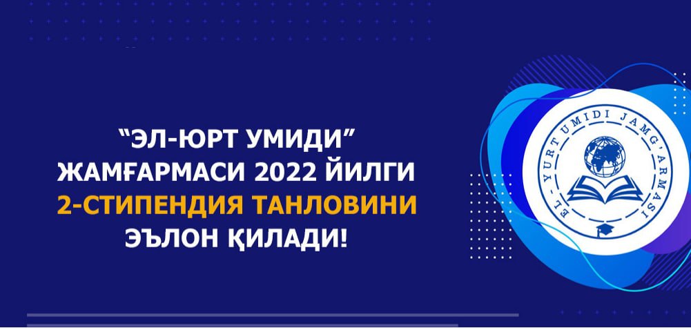 “El-yurt umidi” jamg‘armasi tomonidan ilg‘or xorijiy davlatlarning nufuzli oliy ta’lim muassasalari va ilmiy-tadqiqot muassasalarida bakalavriat, magistratura va doktoranturada ta’lim olish bo‘yicha 2-stipendiya tanlovi e’lon qilindi. Stipendiya tanlovi ikki boshqichdan iborat.
